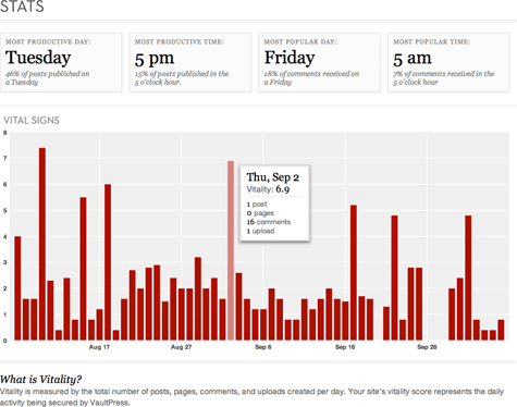The heart of the new VaultPress stats display is a dynamic chart that shows at a glance everything that’s happened on your blog since you started synchronizing with VaultPress. We show you, over time, every post, page, comment, and upload, and we call this measure your site’s Vitality. Hover over any point in time and you’ll see an instant report overlaid on the graph with the activity that happened at that time. This is your new stats nerve center – all of the activity on your WordPress site, in one easy to understand chart.