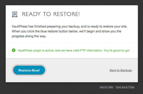 Once VaultPress is done preparing the files, you’ll see a confirmation message. Note that VaultPress needs your FTP information on file to be able to access your site and upload the files you’ve chosen to restore. If in this instance, we didn’t have your FTP information on file, you’d see an error message asking you to supply your FTP details to complete the restore process. Since we’re all set, you can click on the blue Restore Now button: