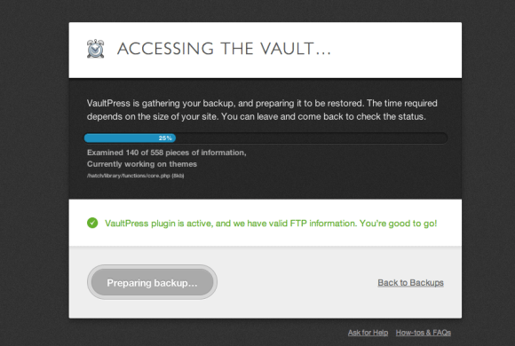 Next, VaultPress will start to prepare your theme for restore. The time required for this step depends on the size of the files.