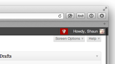 Here’s what your WordPress dashboard toolbar will look like if you have VaultPress installed and we’ve detected a security threat or vulnerability on your site. You can see the VaultPress shield, rampant on a small field of red, and know that we’ve got your back: