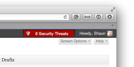 You can hover over the red VaultPress shield to find out how many threats and / or vulnerabilities that we’ve detected: