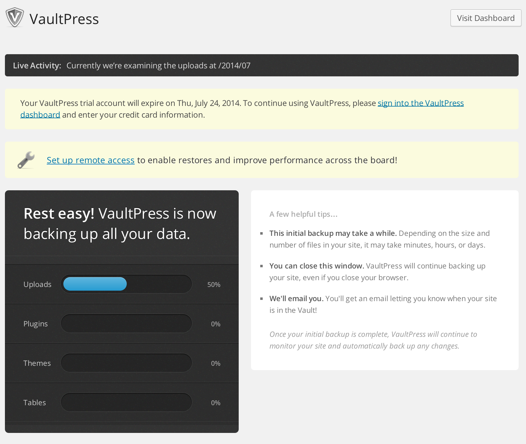 When you click the trial button, you’ll receive a free VaultPress Lite account to try for 5 days. Your site will be automatically connected to VaultPress, and your first backup will begin.